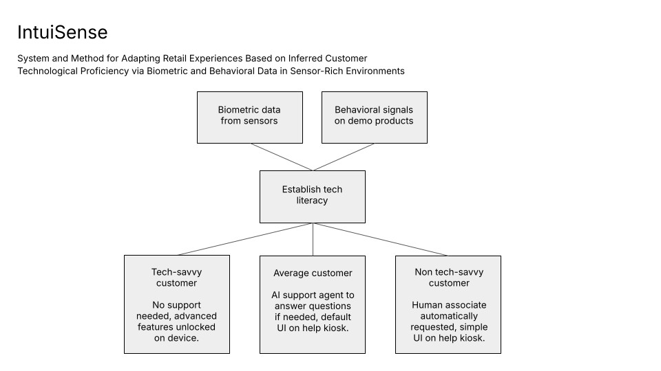 A scoring engine powered by a decision-tree classifier or Bayesian inference model estimates the customer’s tech literacy on a standardized scale. Based on this score, the system dynamically adjusts several experience layers: (1) the user interface complexity of digital kiosks or demo products (e.g., simplified navigation for low-literacy users), (2) the level of support offered, ranging from AI chatbot assistance to live associate intervention, and (3) the amount of informational content shown. The system continuously updates user classification throughout the session to refine engagement in real time. Privacy safeguards ensure all biometric data is ephemeral unless opted in. IntuiSense is compatible with fixed and mobile retail spaces such as kiosks, trade shows, and truck-based pop-ups.