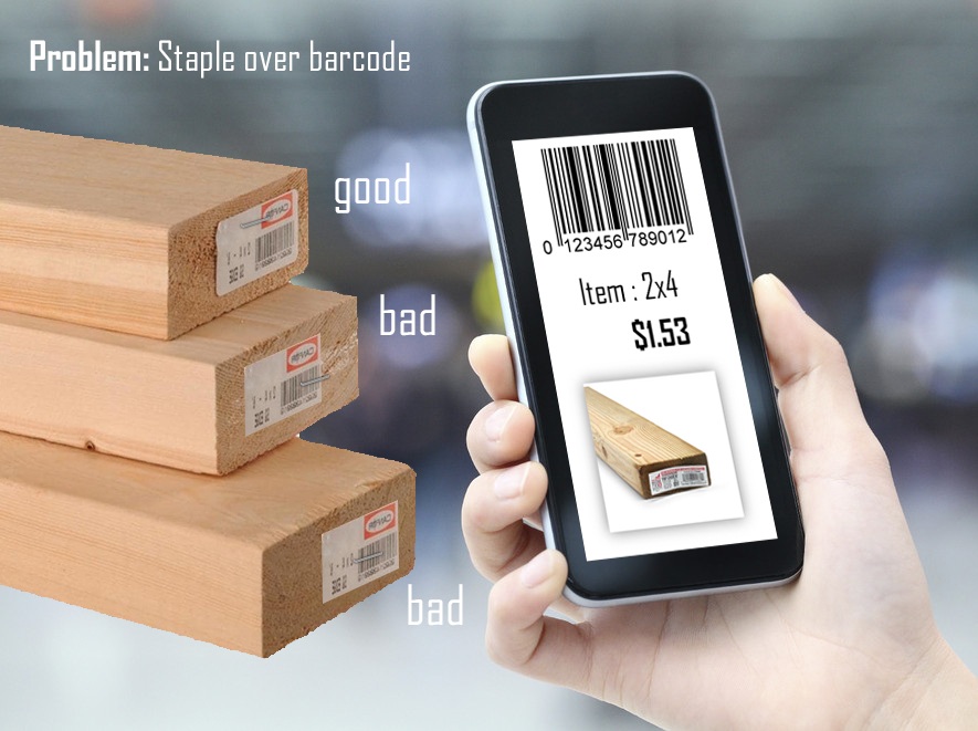 Problem: Some barcodes are difficult to scan because of their size and the method used to attach them to a product. I routinely go to Building Supply Store to get 2x4's for a building project. The 2x4's have a small barcode tag on the end. Because of the size, they staple the tag to the wood. Most of the time they staple through the center of the code, making it unreadable. Either they must take the time to look it up or they have someone go to the shelf and memorize the SKU number.