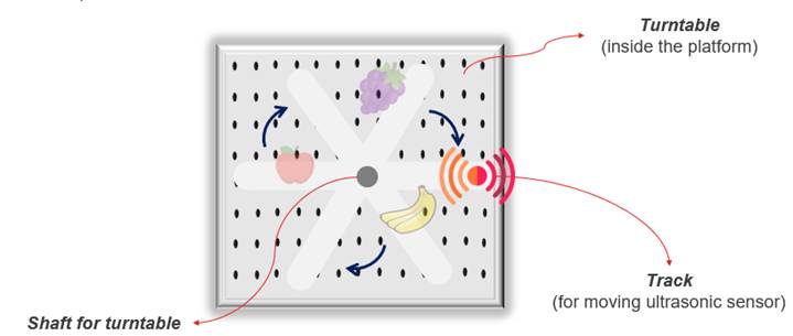 Through rotating the plate and the motor will carry the sensor to detect the fruits/vegetables on any location of the platform.