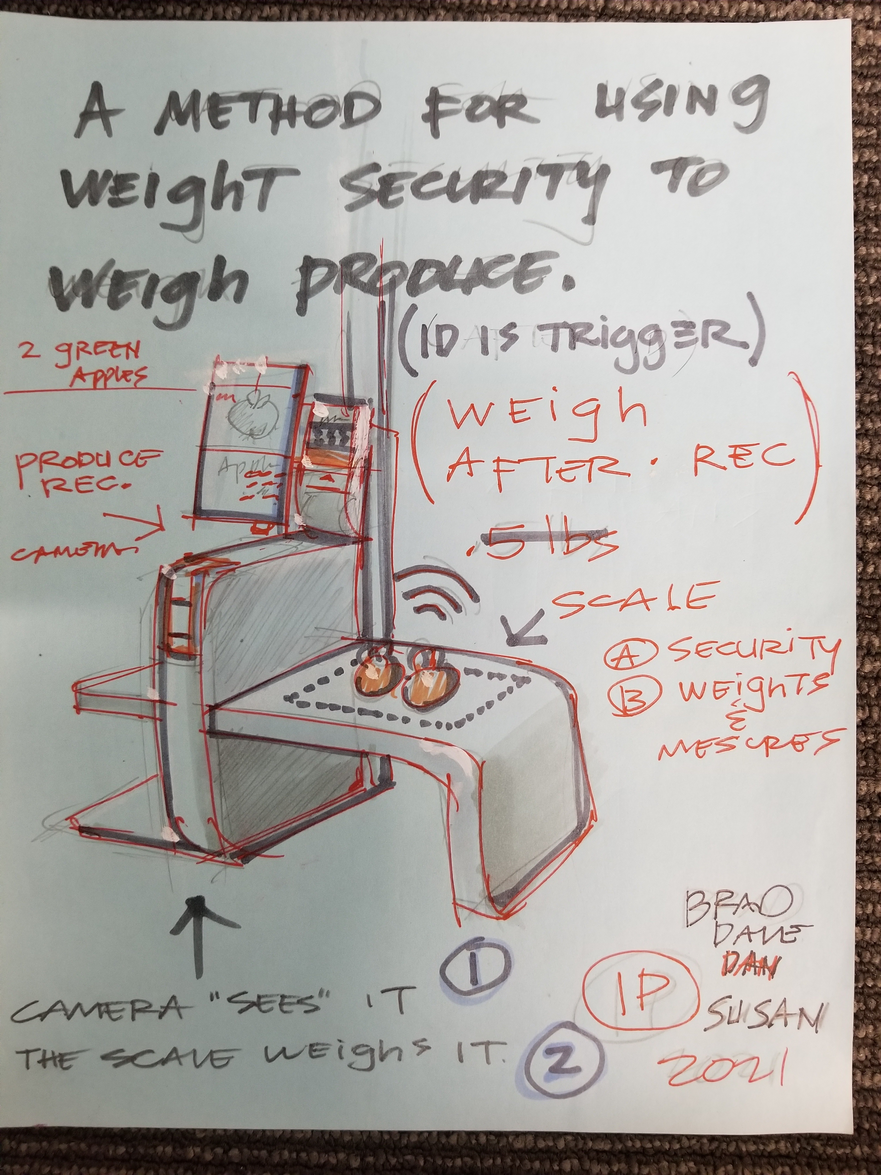 Use the existing security scale as a weights and measures scale. It’s small and is 5% the price of a bi-optic scanner scale. The process would start with the produce recognition, confirm the produce item i.e., apple. That would switch the scale out of security mode into weights and measures mode to gather the delta weight. If no more produce is recognized, then it could switch back to security mode. Alt: It could be purely a weight scale without security.