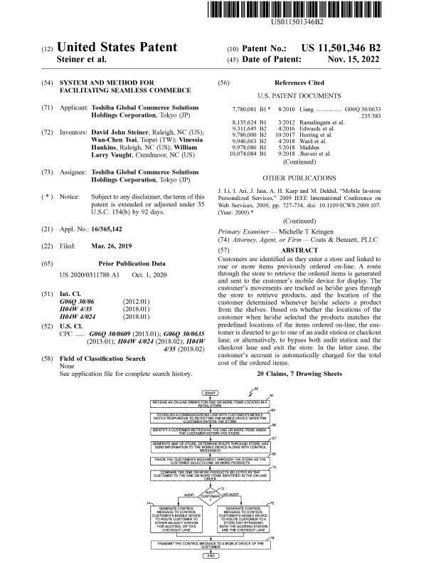 Customers are identified as they enter a store and linked to one or more items previously ordered on-line. A route through the store to retrieve the ordered items is generated and sent to the customer's mobile device for display. The customer's movements are tracked as he/she goes through the store to retrieve products, and the location of the customer determined whenever he/she selects a product from the shelves. Based on whether the locations of the customer when he/she selected the products matches the predefined locations of the items ordered on-line, the customer is directed to go to one of an audit station or checkout lane, or alternatively, to bypass both audit station and the checkout lane and exit the store. In the latter case, the customer's account is automatically charged for the total cost of the ordered items.