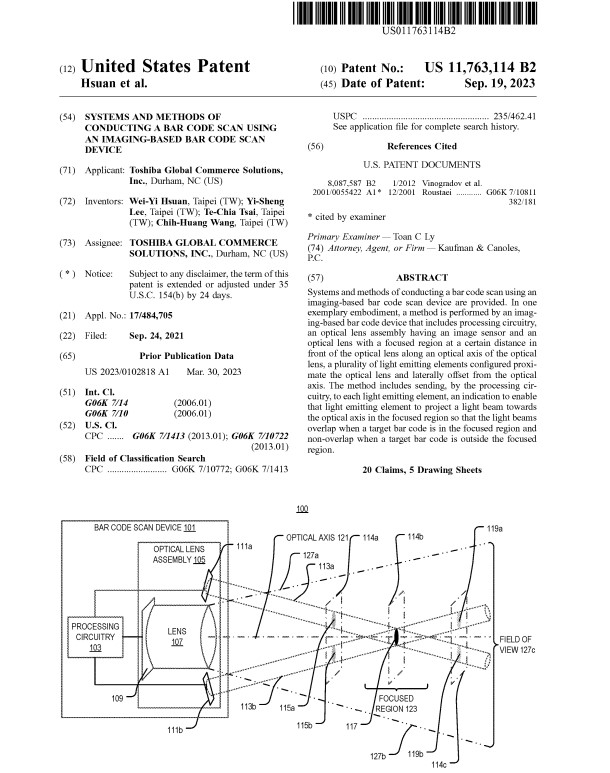 Systems and methods of conducting a bar code scan using an imaging-based bar code scan device are provided. In one exemplary embodiment, a method is performed by an imaging-based bar code device that includes processing circuitry, an optical lens assembly having an image sensor and an optical lens with a focused region at a certain distance in front of the optical lens along an optical axis of the optical lens, a plurality of light emitting elements configured proximate the optical lens and laterally offset from the optical axis. The method includes sending, by the processing circuitry, to each light emitting element, an indication to enable that light emitting element to project a light beam towards the optical axis in the focused region so that the light beams overlap when a target bar code is in the focused region and non-overlap when a target bar code is outside the focused region.