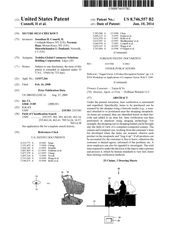 Under the present invention, item verification is automated and expedited. Specifically, items to be purchased can be scanned by the shopper using a barcode reader (e.g., a scanner) attached to or positioned near the shopping receptacle. As items are scanned, they are identified based on their barcode and added to an item list. Item verification can then performed at checkout using imaging technology. For example, the shopping cart or shopping basket can be brought into the field of view of a computer-connected camera. The camera and computer can, working from the customer's item list developed when the items are scanned, observe each product in the receptacle and "ring it up". If all products can be accounted for, the customer is free to leave; otherwise the customer is denied egress, informed of the problem, etc. A store employee can also be signaled to investigate. The total time required to make the decision is the time to take a picture and process it, which by human standards is very fast; faster than existing verification methods.
